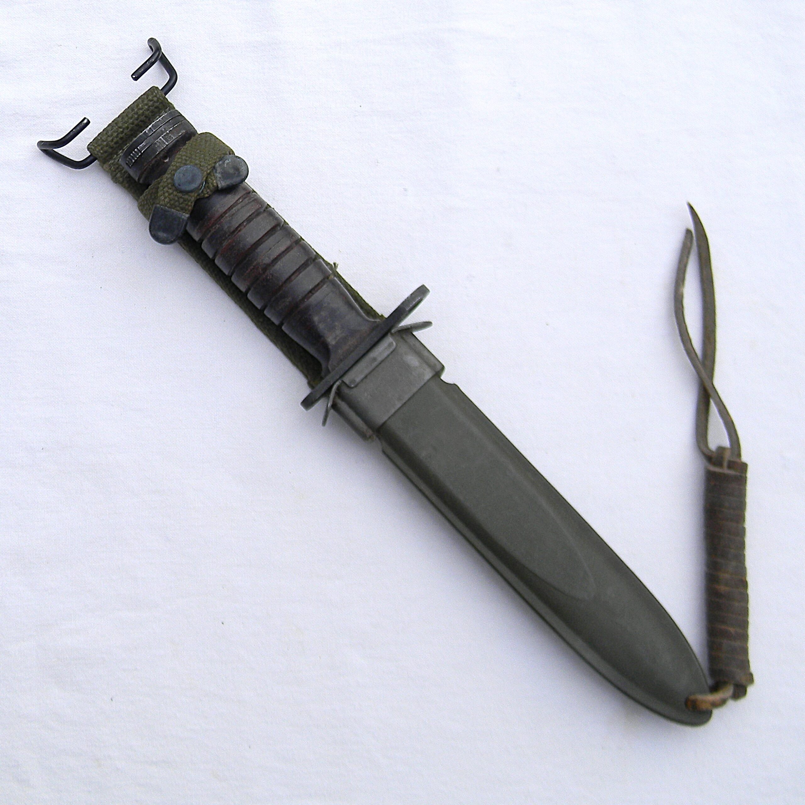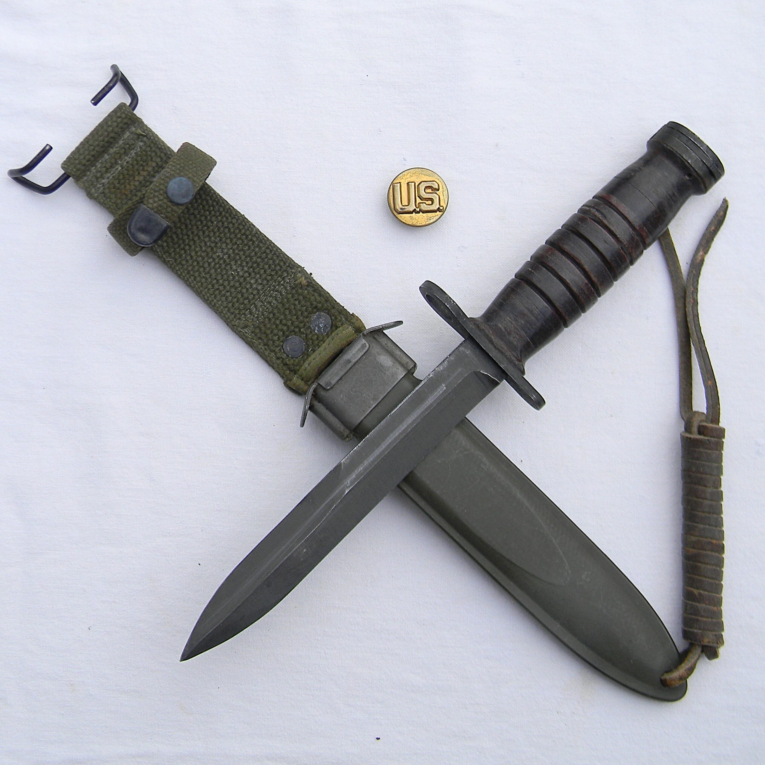 The M4 was intended to be used as a bayonet on a M1 carbine but it was mostly utilized as a fighting and utility knife, just like its “big brother” M3 Trench knife. Both edged weapons were popular with the troops and were used expensively in all theaters of the war. See the WW2 era photo of similar M4 bayonets on US 17th Airborne Division troops firing the M18 recoilless rifle at German positions somewhere around Essen, Germany. On the second WW2 ear photo taken past the Siegfried line in Germany one can clearly see that US M1 carabines did not come with a lug under the barrel to attach a bayonet. These photos are used as a reference only and will not be included with the lot.