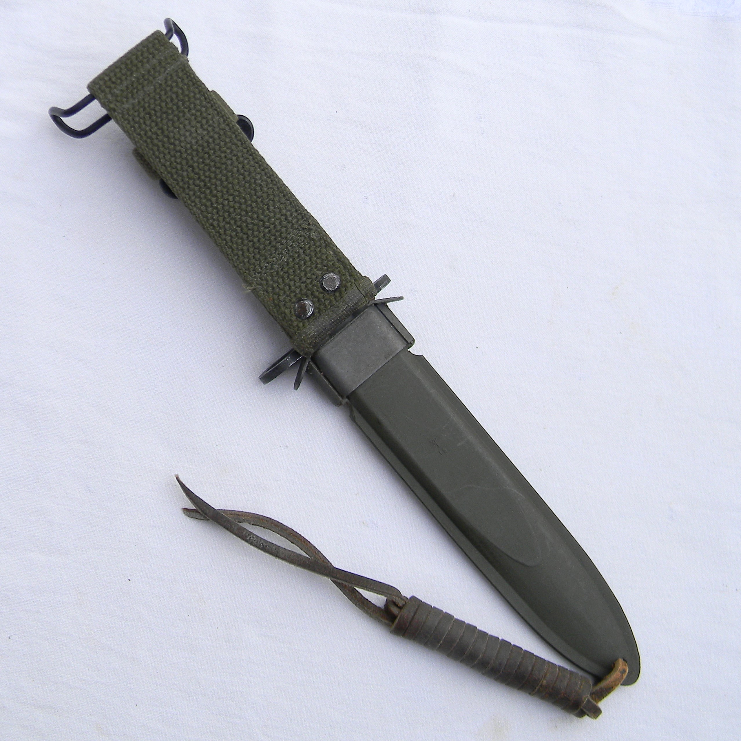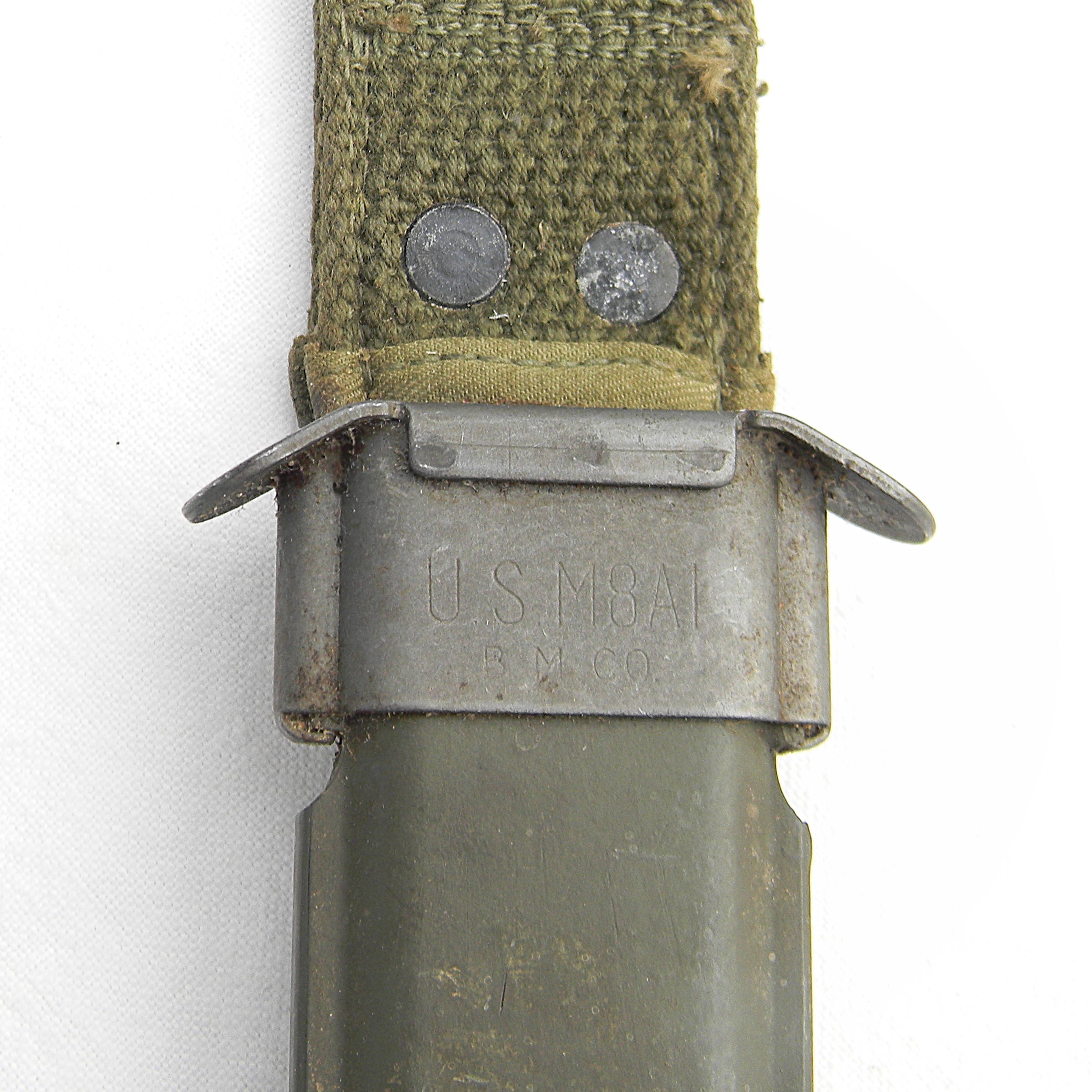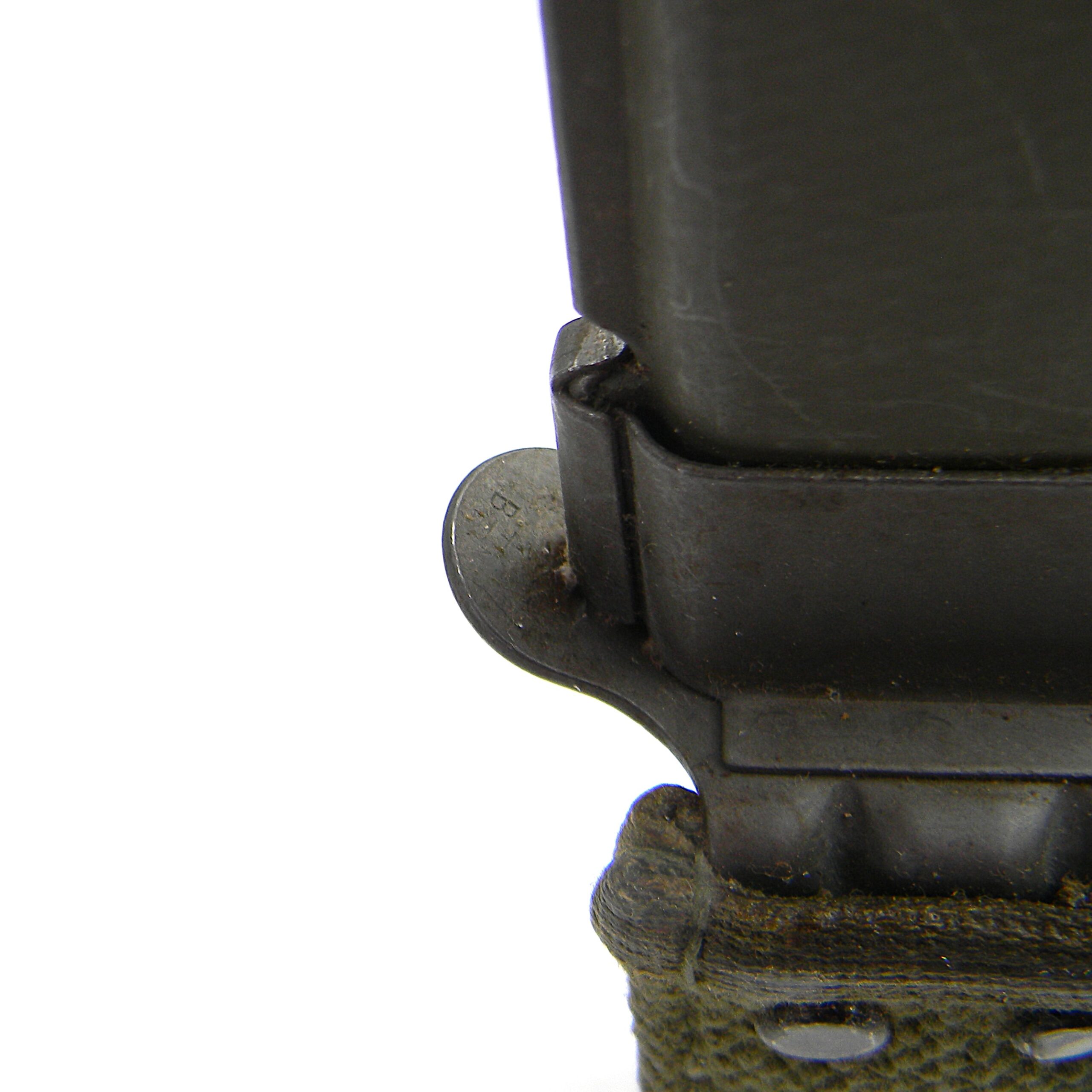This M4 is about 11-5/8” / 29.5 cm overall; Parkerized finish blade is about 6-5/8″ / 17 cm long. The blade has not been re-sharpened; original factory edge is razor-sharp still; the tip is intact. Rare early-production “6 groves” type handle; all stacked leather washers are excellent; parkerized steel muzzle ring and pommel are intact. The muzzle ring is marked with the “flaming bomb” US ordinance mark and U.S. M4 / UTICA stamp on the top. The pommel is excellent with no contact marks; bayonet lock/release is 100% functional; all parts are tight with no play. Original M8A1 scabbard with the original leather tie-down cord is in excellent unused condition as well. The webbing is intact and rust-free; all original stitching is intact; the keeper is nice and tight. This scabbard was manufactured by Beckwith Mfg Co. (BM CO.) division of Victory Plastics.