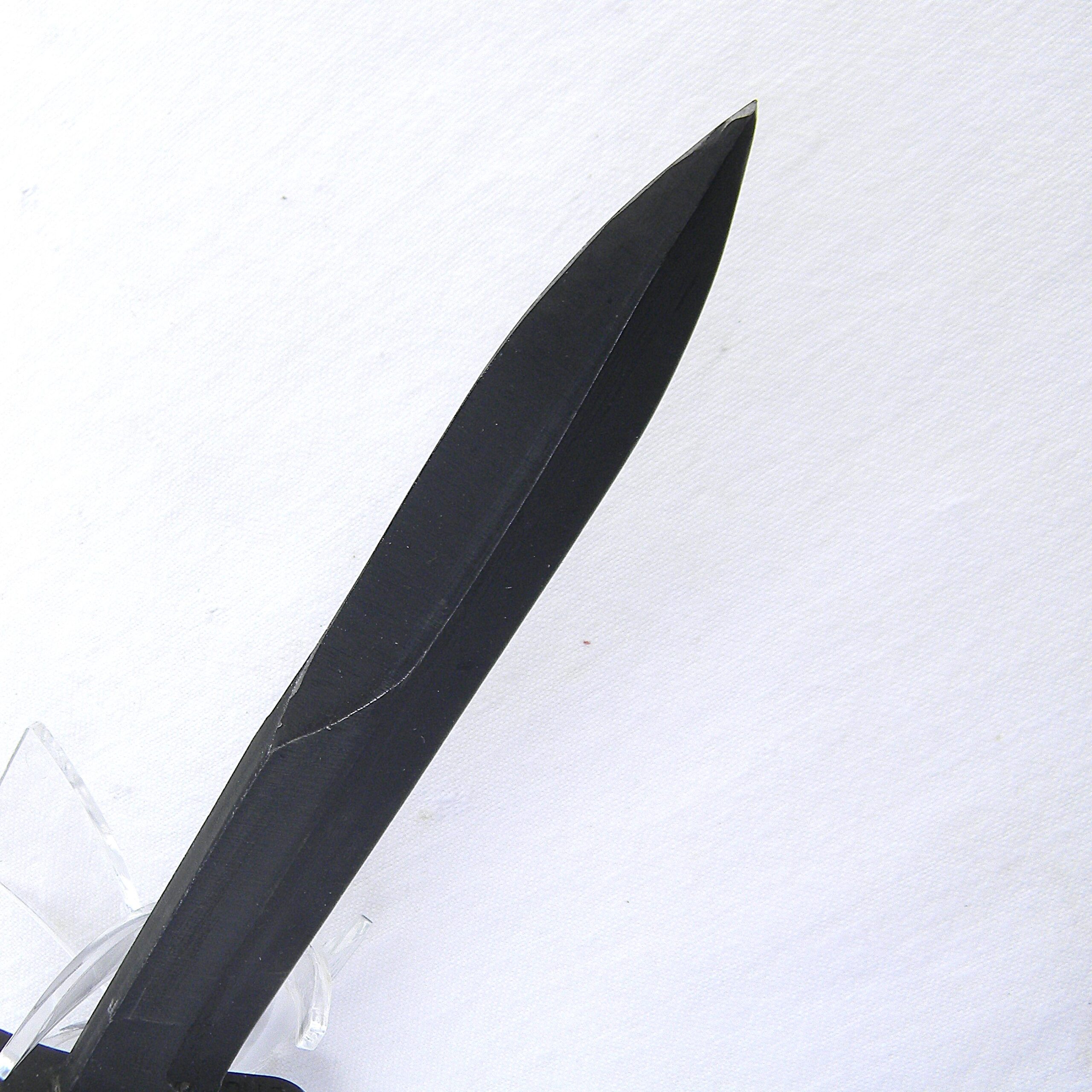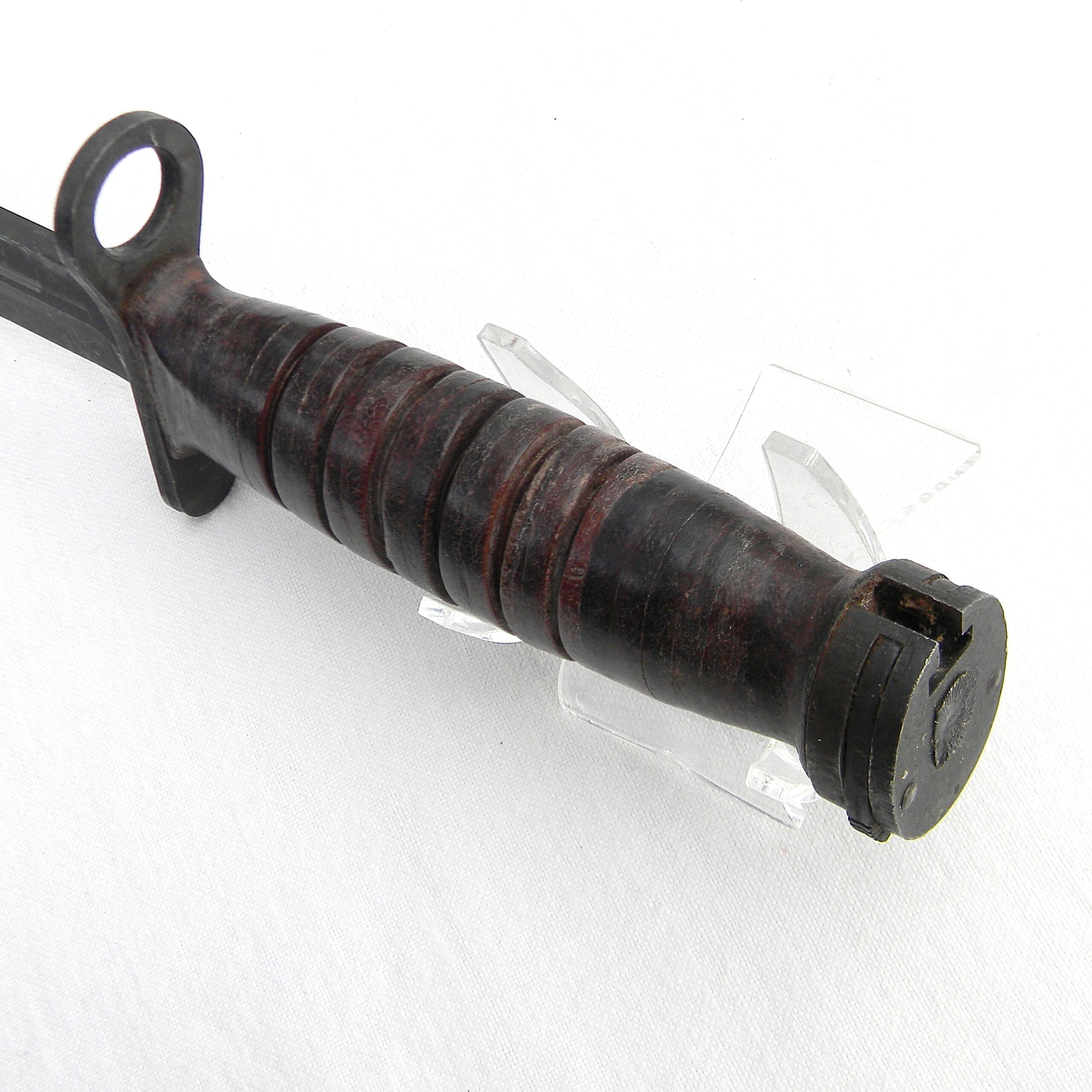 Original WW2 era M1 carbine M4 bayonet in rare UNUSED condition; this specimen was manufactured by Utica Cutlery in Utica, NY. This M4 comes with the original issue M8A1 composition scabbard with original leather tie-down cord still attached, also unused. This original WW2 era M4 bayonet type is VRY rare this nice as most had seen heavy use during WW2. Also, many tens of thousands of M4s were refurbished after WW2 and used extensively during the war in Korea; many more were transferred to the member countries’ militaries after the NATO block was established. During the WW2 years Utica has manufactured about 515,000 M4 bayonets, however only a fraction of original WW2 era specimens survived in collectable grades.