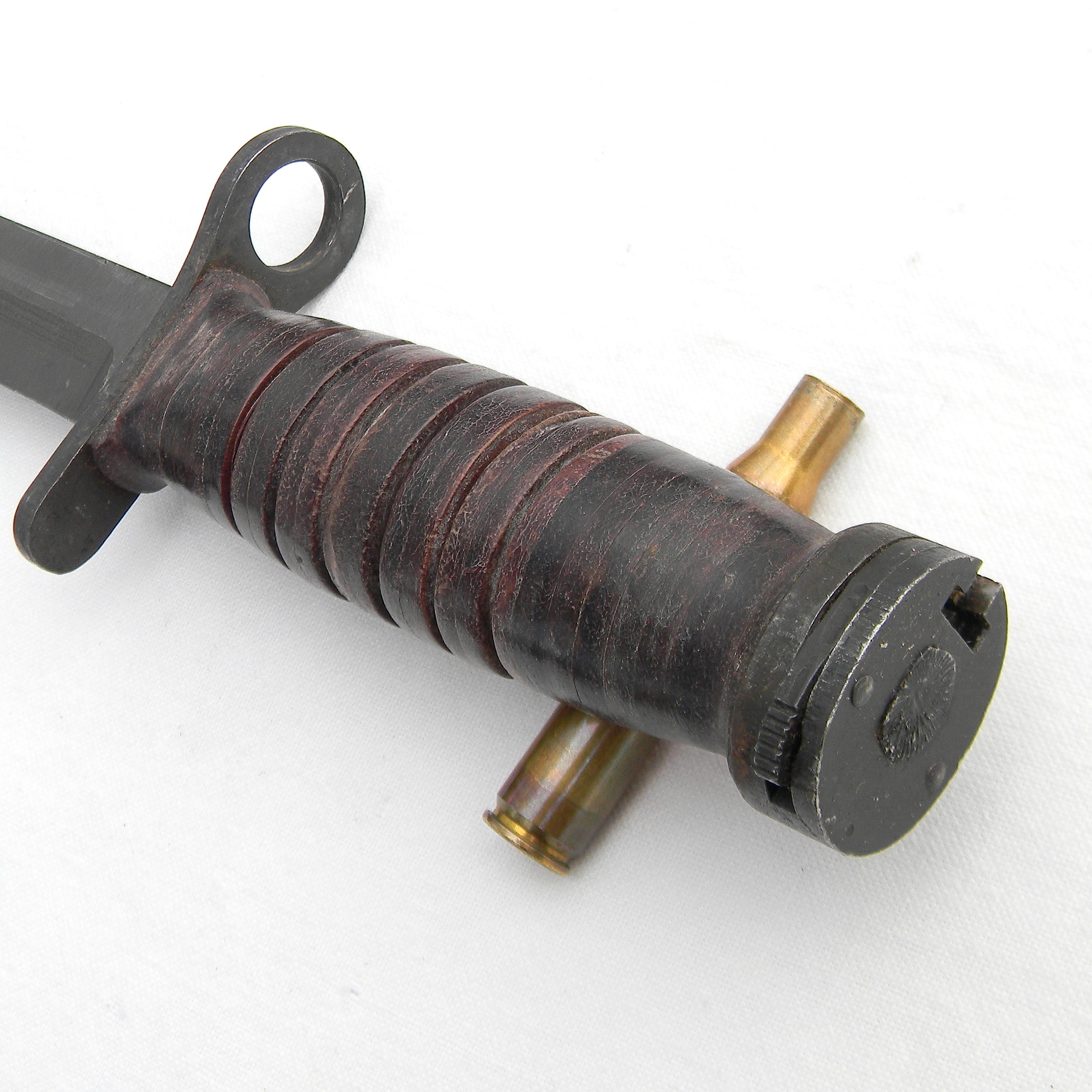 This rare unused original WW2 Utica M4 bayonet and M8A1 composition scabbard are in 100% serviceable condition still; this type is VERY rare this nice. These are the actual photos; spent brass is not included with the bayonet I have a few more WW2 US-made bayonets, as well as some scarce WW1 and WW2 era fighting daggers and trench knives made in the US, Great Britain, France, Germany, and other countries available for sale – please take a look in the Militaria section.