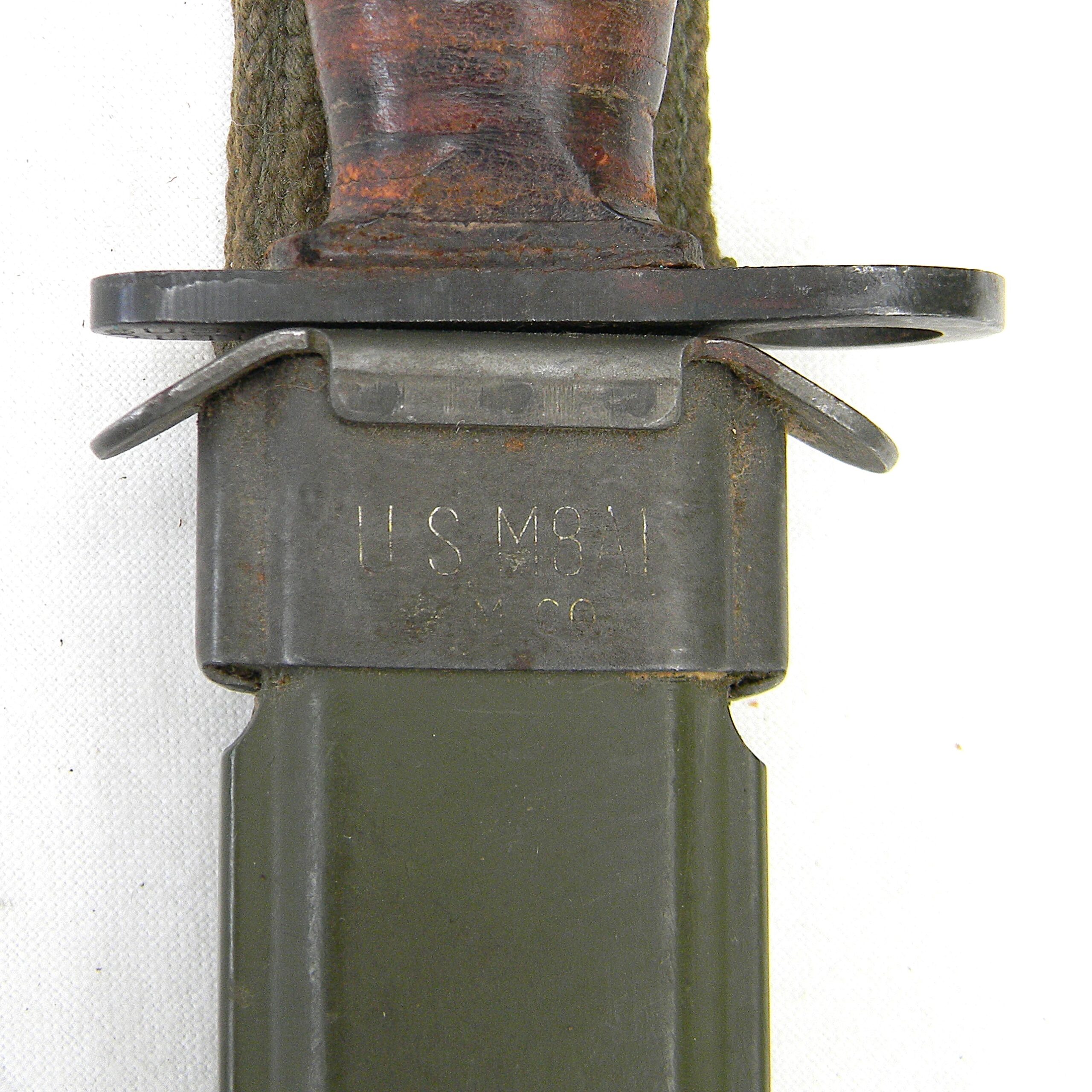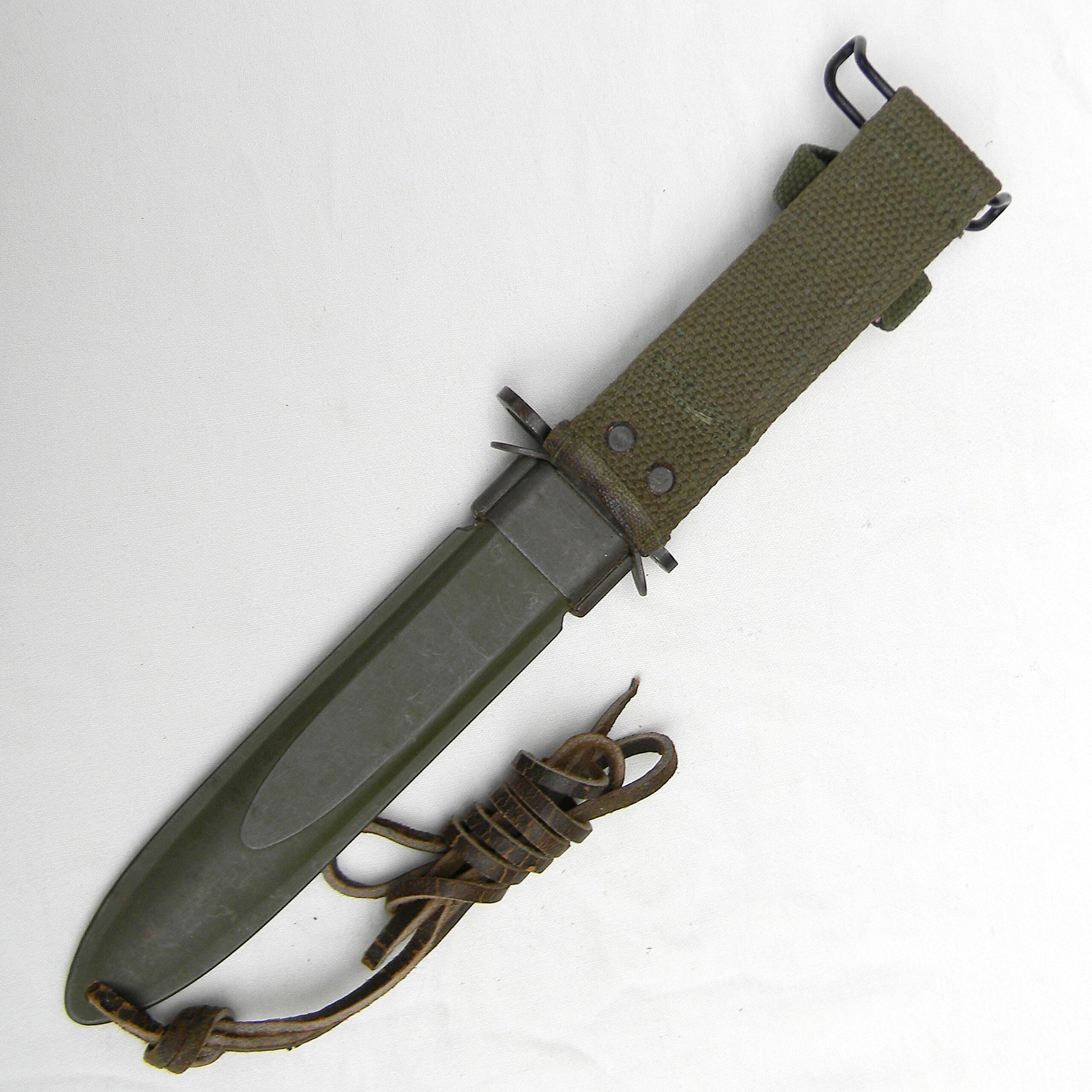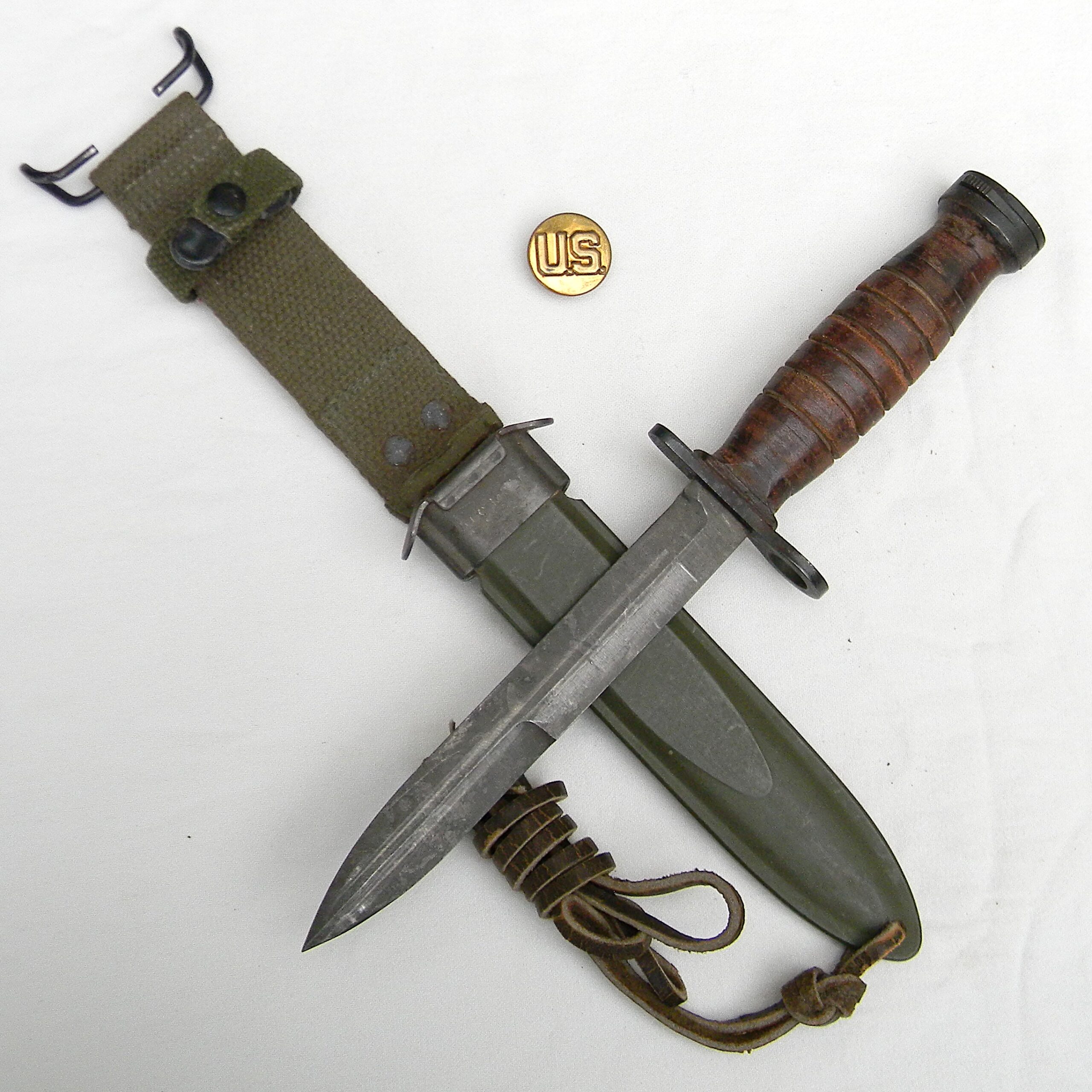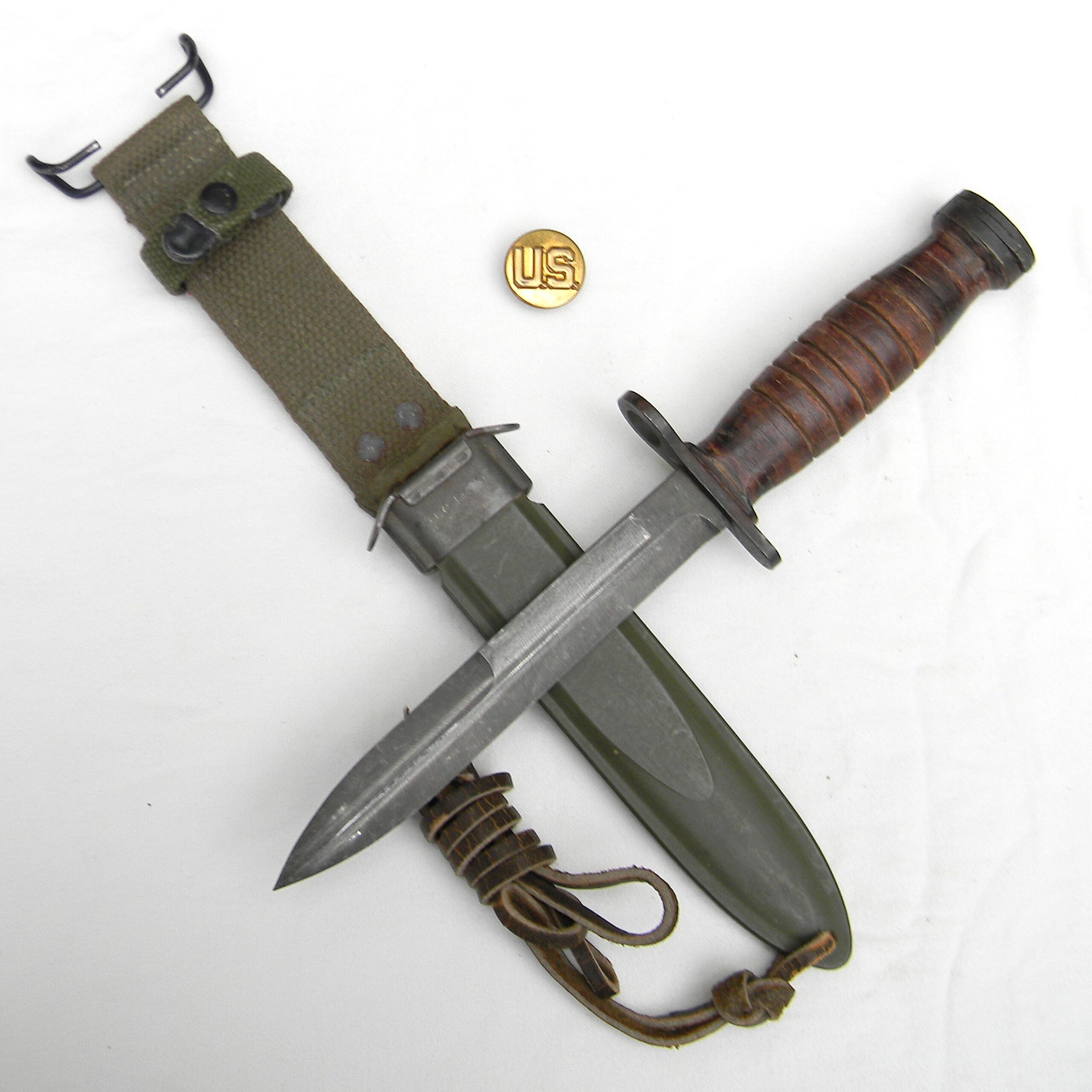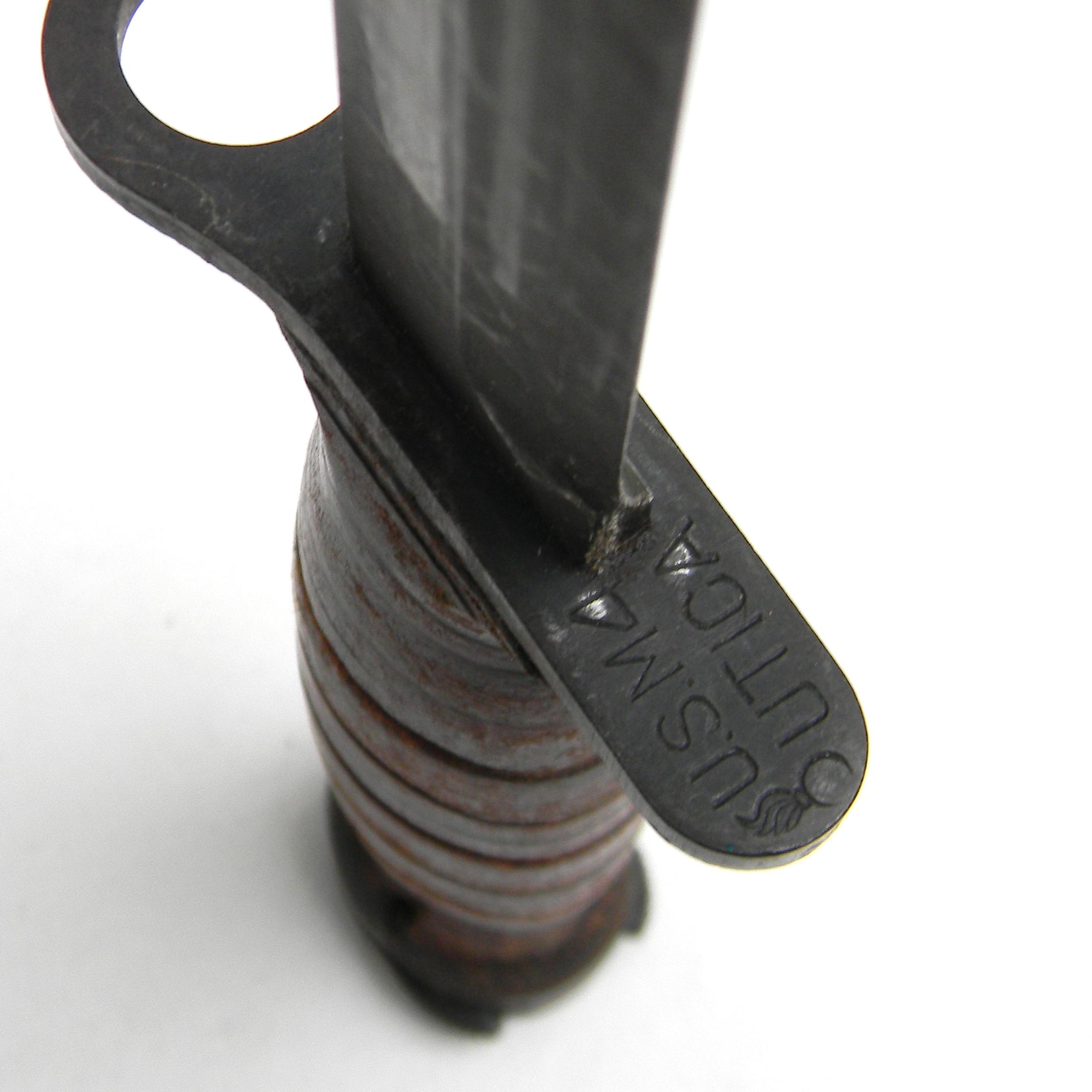 WW2 Utica M4 bayonet, original M8A1 Victory Plastics Beckwith Mfg Co composition scabbard with leather leg tie. Rare UNUSED; excellent overall condition, considering the age. FREE USPS PRIORITY MAIL SHIPPING WITHIN THE U.S. FOR THIS ITEM!