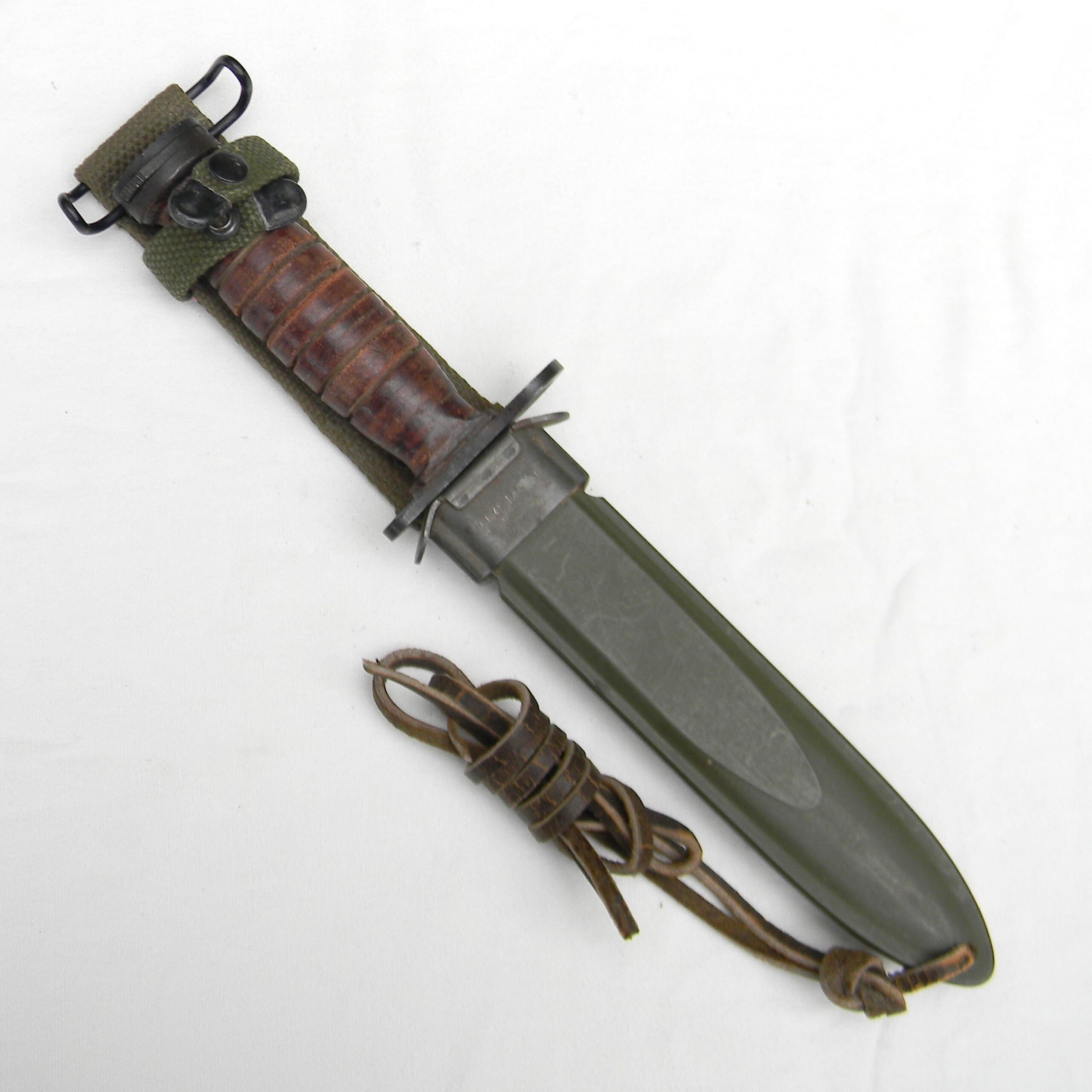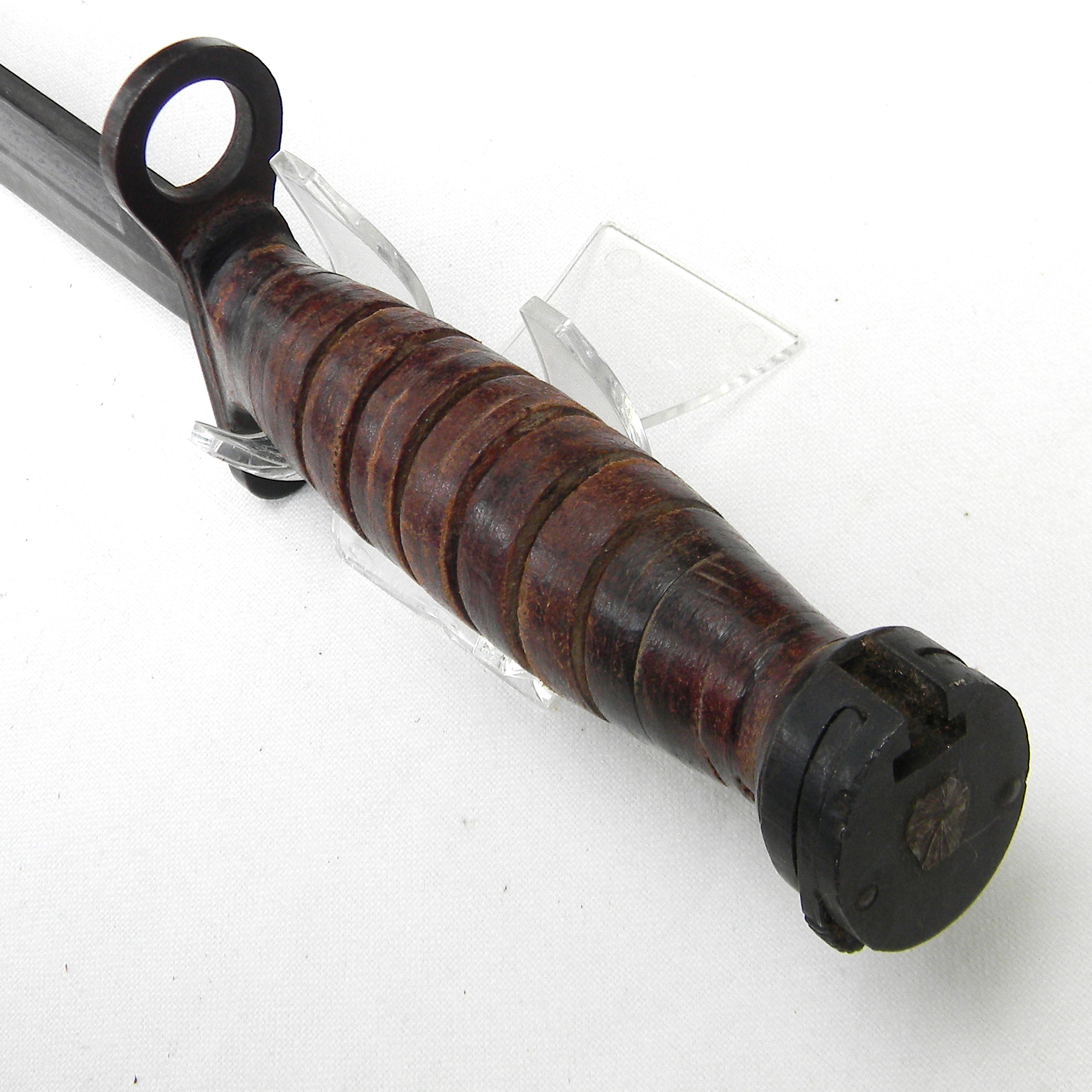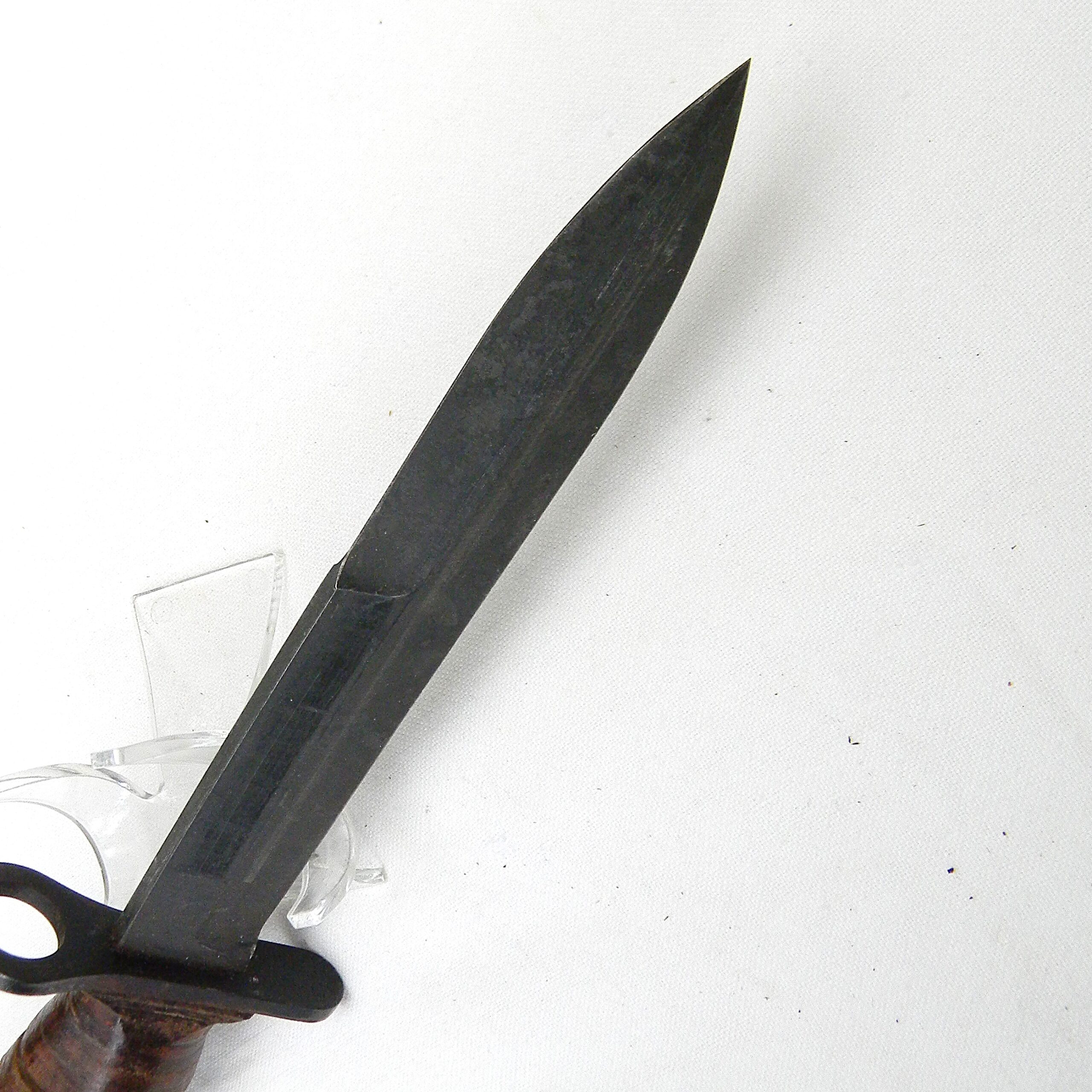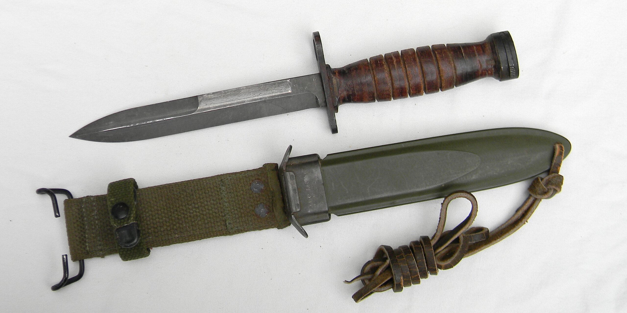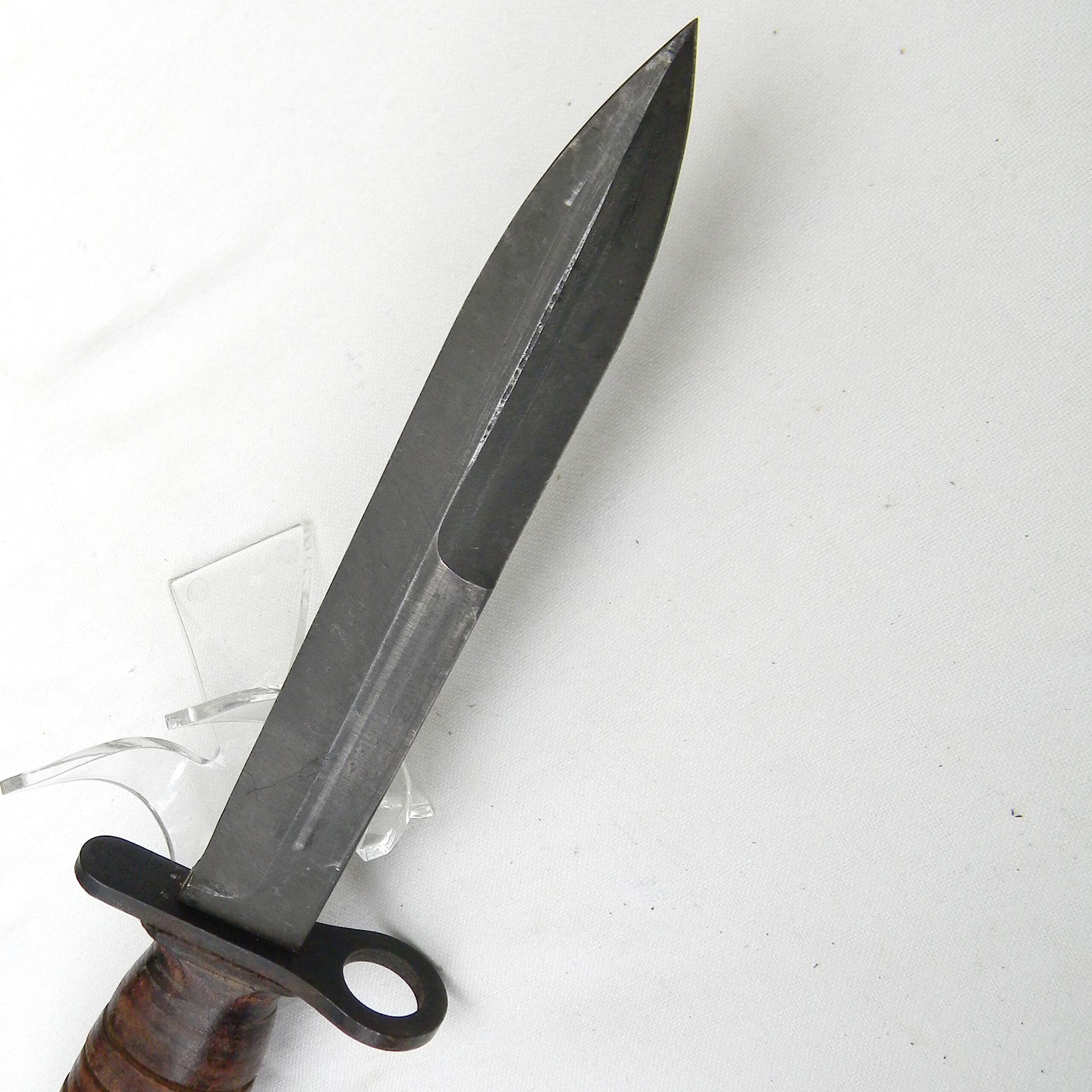 WW2 Utica M4 bayonet, original M8A1 Victory Plastics Beckwith Mfg Co composition scabbard with leather leg tie. Rare UNUSED; excellent overall condition, considering the age. FREE USPS PRIORITY MAIL SHIPPING WITHIN THE U.S. FOR THIS ITEM!