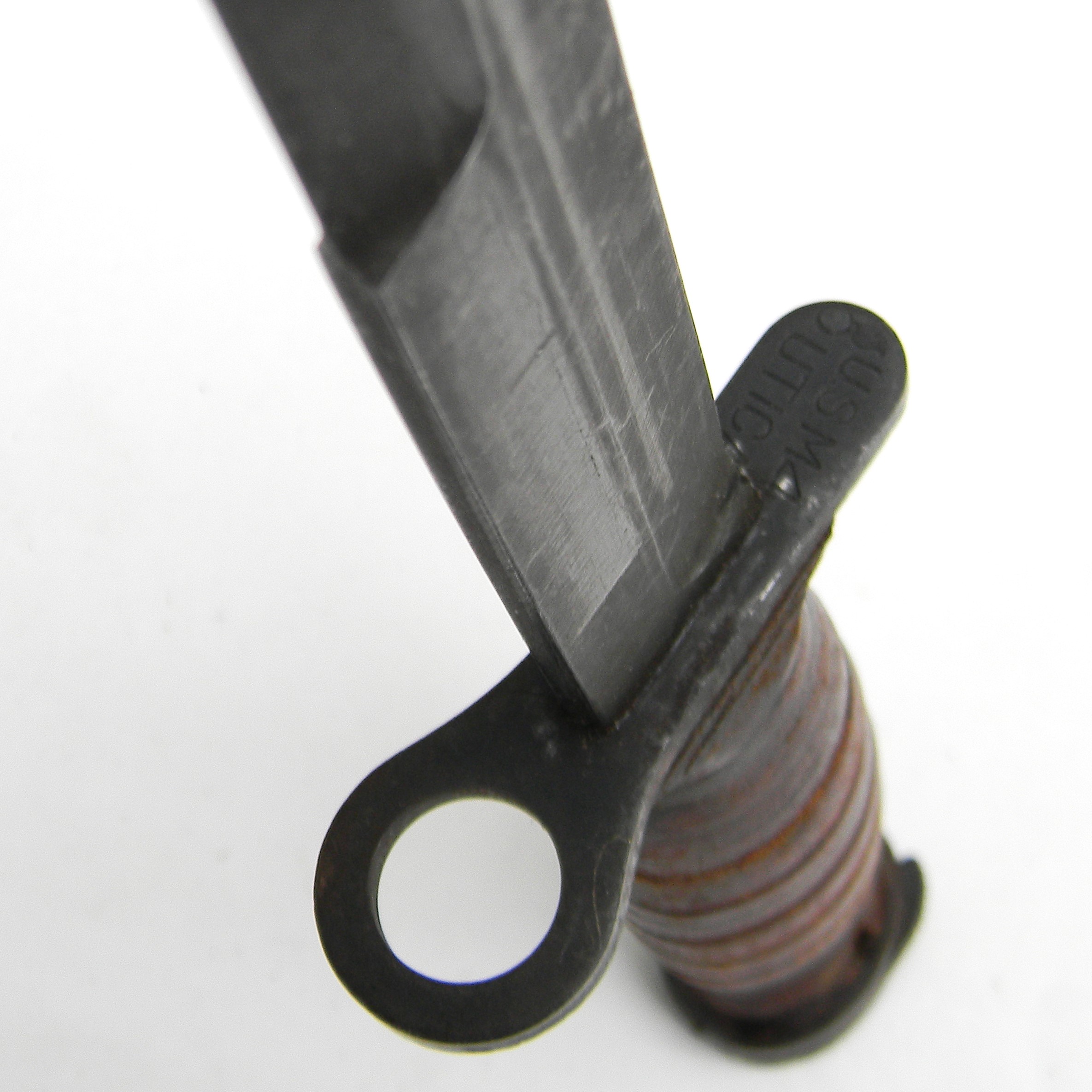 A museum quality original WW2 era M1 carbine M4 bayonet in rare unused condition. This specimen was manufactured by Utica Cutlery Co. in Utica, NY; it comes with the original issue M8A1 composition scabbard with the leather leg-tie still attached, also in excellent condition. This type was intended to be used as a bayonet on a M1 carbine but almost all M1 carbines in service during WW2 were issued without the bayonet lug, so M4s were mostly utilized as a fighting/utility knives. One can clearly see the absence of the bayonet attachment point on the M1 barrel issued to a infantryman serving with the 28th Infantry Division (the photo was taken in September 1944, on the German Border near Luxembourg). The M4 was quite popular with the troops; see the WW2 era photo of similar M4 bayonets on US 17th Airborne Division troops firing the M18 recoilless rifle at German positions somewhere around Essen, Germany (photos are used as a reference only and will not be included with the lot).