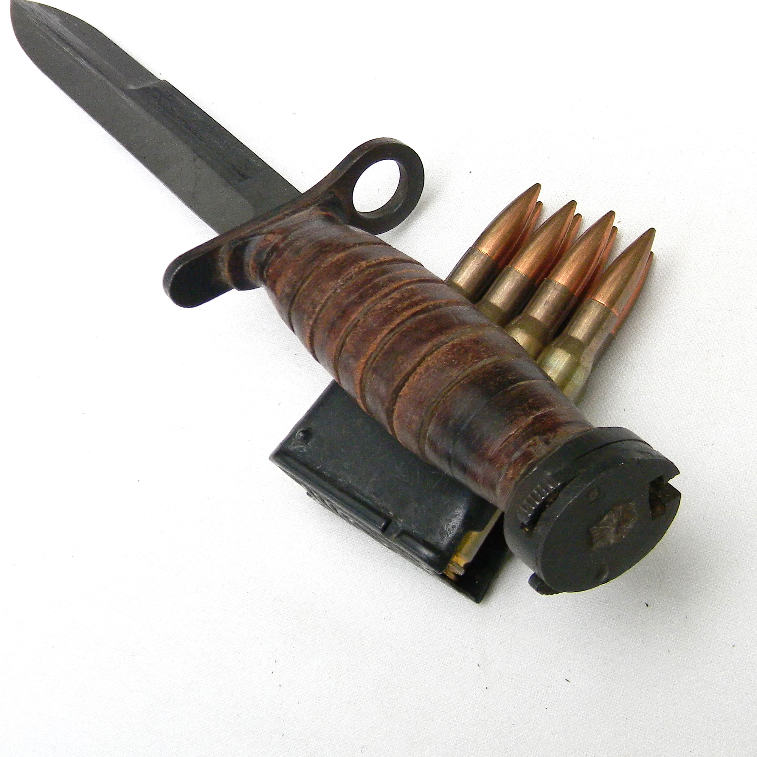 This original WW2 Utica M4 bayonet and M8A1 composition scabbard are in 100% serviceable condition still; this type is rare in unused condition. These are the actual photos; spent brass is not included with the bayonet I have a few more WW2 US-made bayonets, as well as some scarce WW1 and WW2 era fighting daggers and trench knives made in the US, Great Britain, France, Germany, and other countries available for sale – please take a look in the Militaria section.