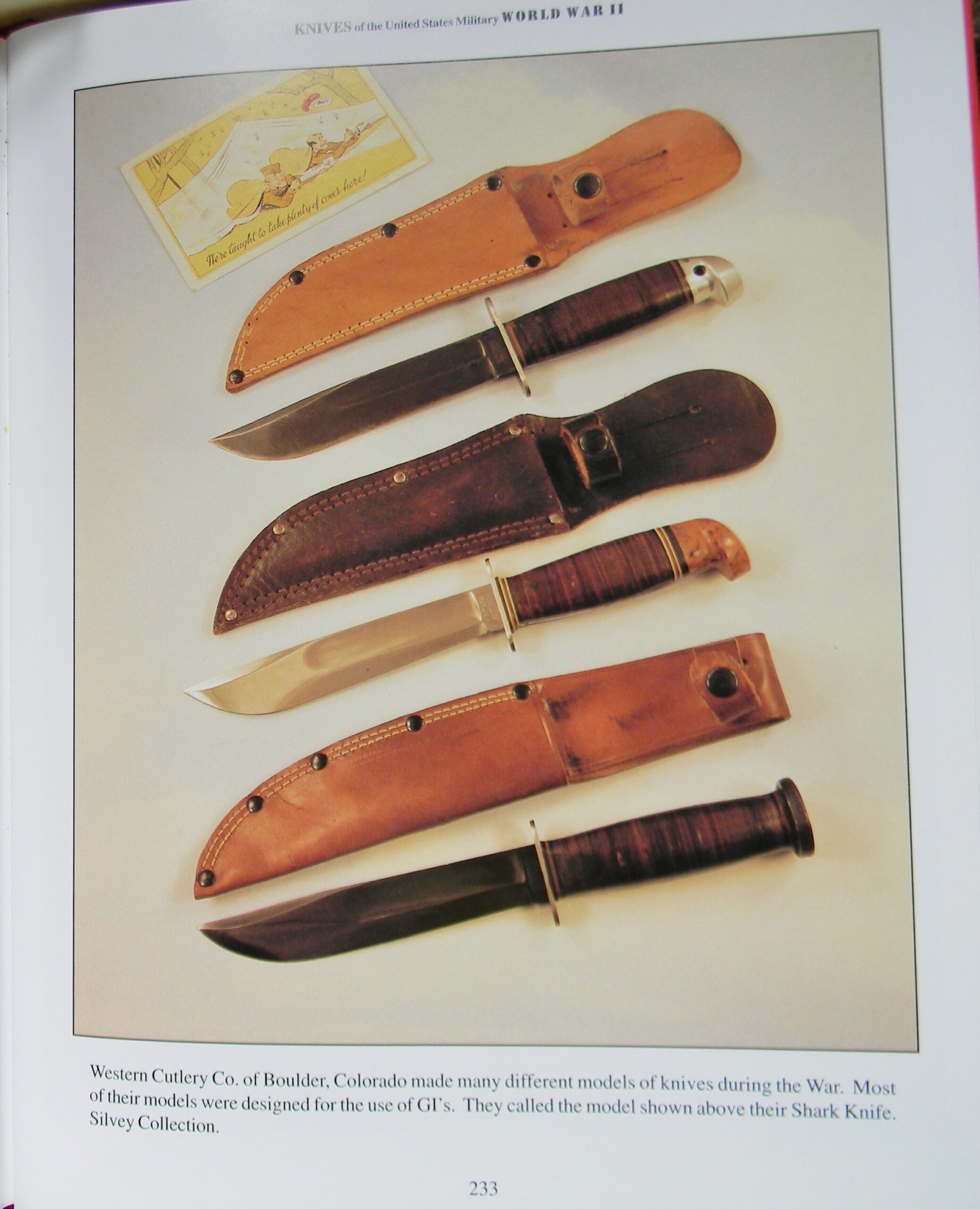 Original WW2 era American fighting knife manufactured during the war by Western Cutlery in Boulder, Colorado – this type is commonly known as the “Shark” model fighting knife. This handy knife was very popular with the troops and thousands were used as intended in virtually every theater of the war. This is an early war production Type 1 Shark with a bronze guard and a solid aluminum pommel. Later Shark issues had iron guards and Bakelite pommels since strategic materials such as aluminum and bronze mid-war have been reserved for uses “essential for the war effort”. This exact type is illustrated on page 233 of the KNIVES OF THE UNITED STATES MILITARY WORLD WAR II book by Michael W Silvey – a well-established expert and author of many books on the subject of US military edged weapons (see page’s scan attached).