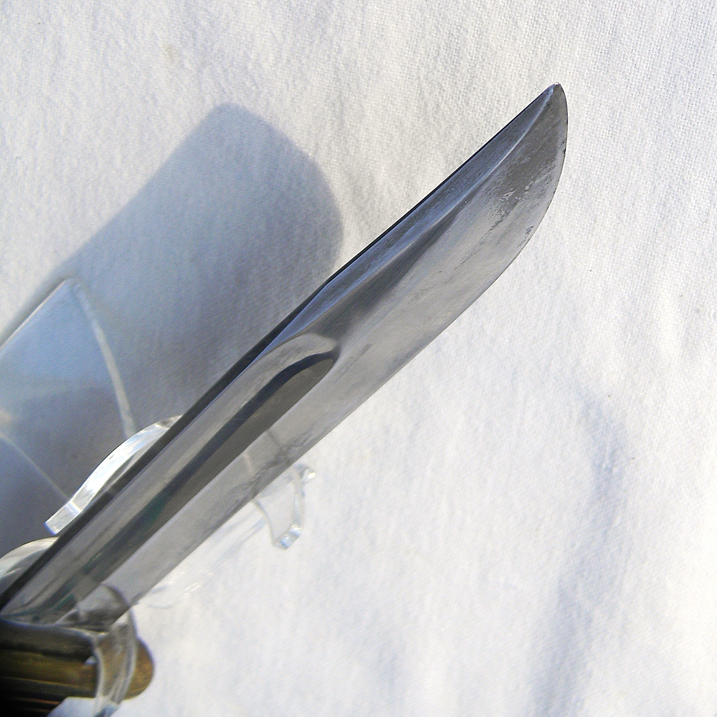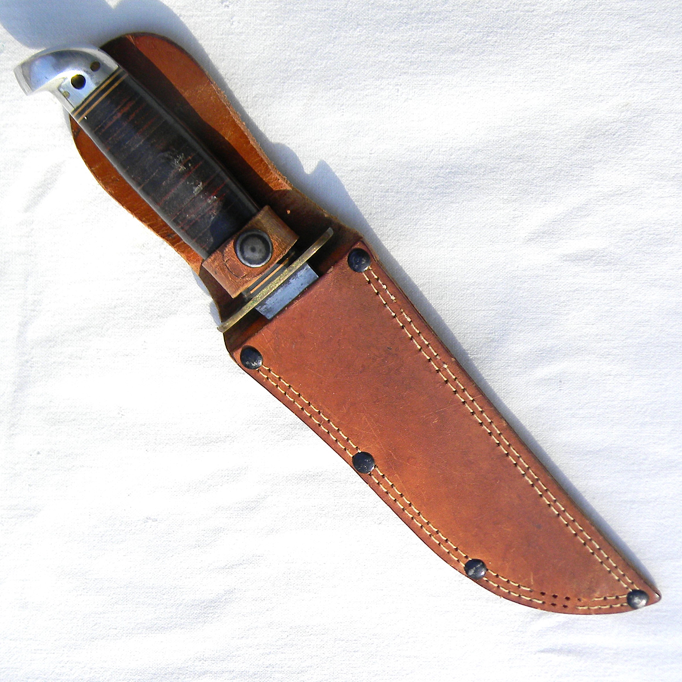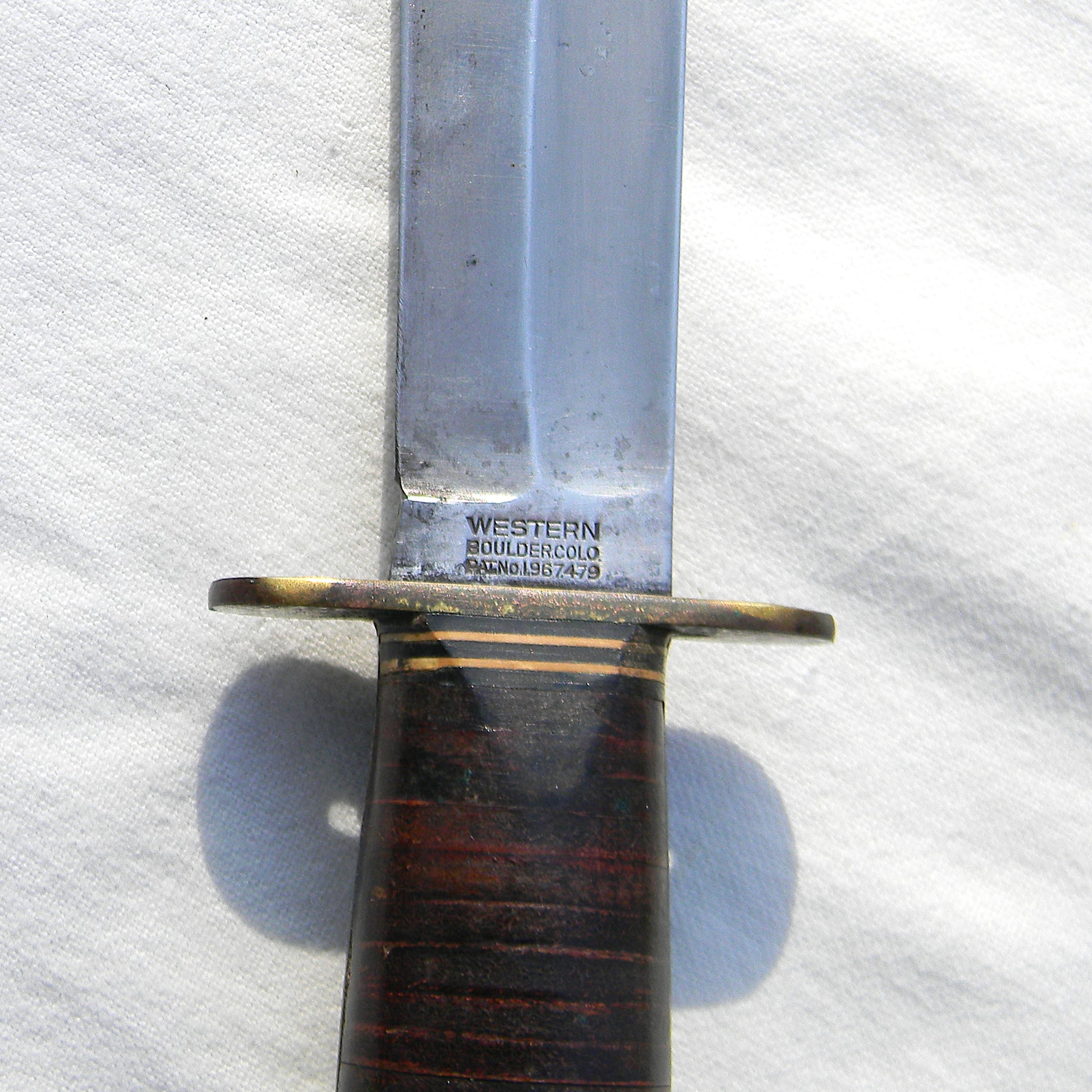 Stacked leather washers handle with colored fiber spacers at the ends, an early-issue aluminum pommel and bronze guard. The handle is tight; all parts are solid with no play. No ding marks on the spine or typical edge nicks on the blade; a few light contact marks on the pommel are noted for accuracy. Most of these Shark fighting knives were used in the field as intended; it’s not a particularly scarce type but this type is hard-to-find in such a good shape. The blade has been gently re-sharpened; the edge is very sharp still; the tip is intact. Ricasso is stamped WESTERN / BOULDER, COLO. / PAT. NO. 1,967,479. The knife is 10-1/4″ / 26 cm overall; the blade is 5-7/8″ / 15 cm long. The scabbard is in excellent condition for the type – the keeper is intact, no cuts at the throat or puncture holes near the tip. Some minor stitching loss near the tip but that’s an easy fix.